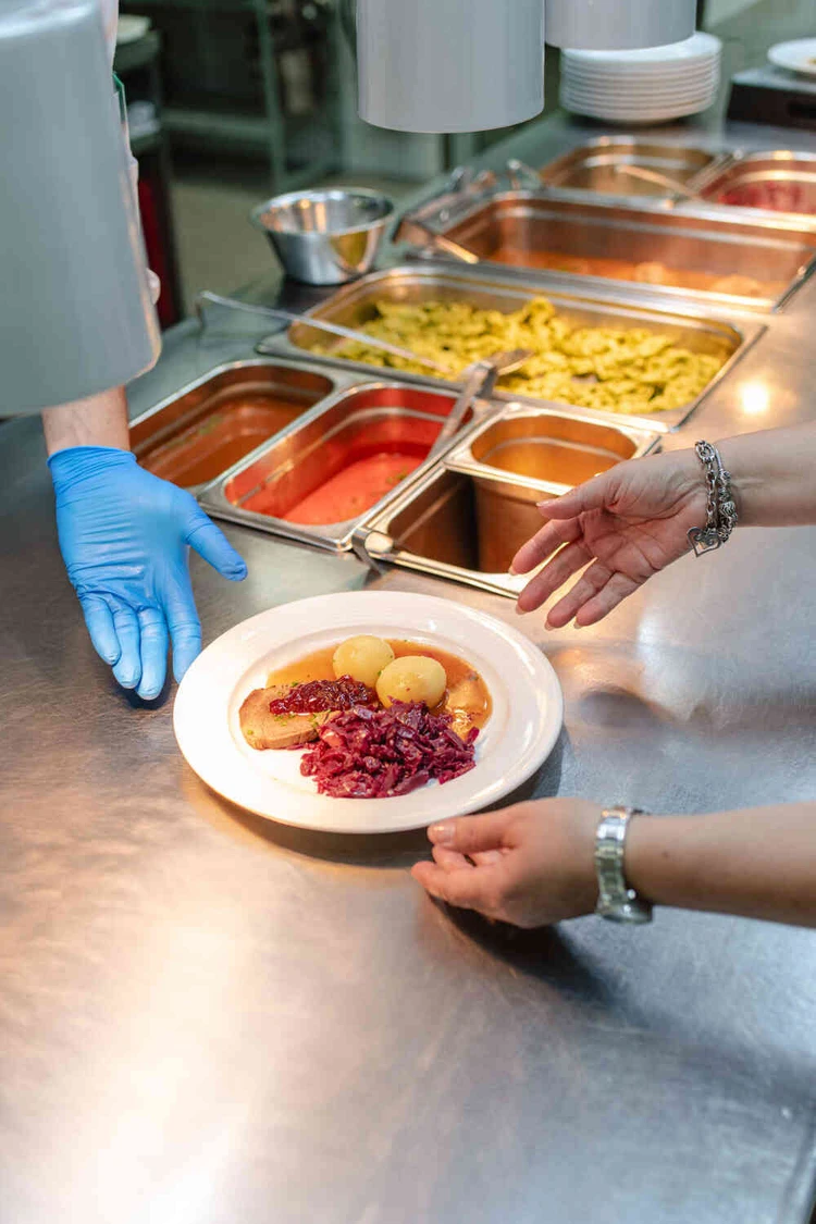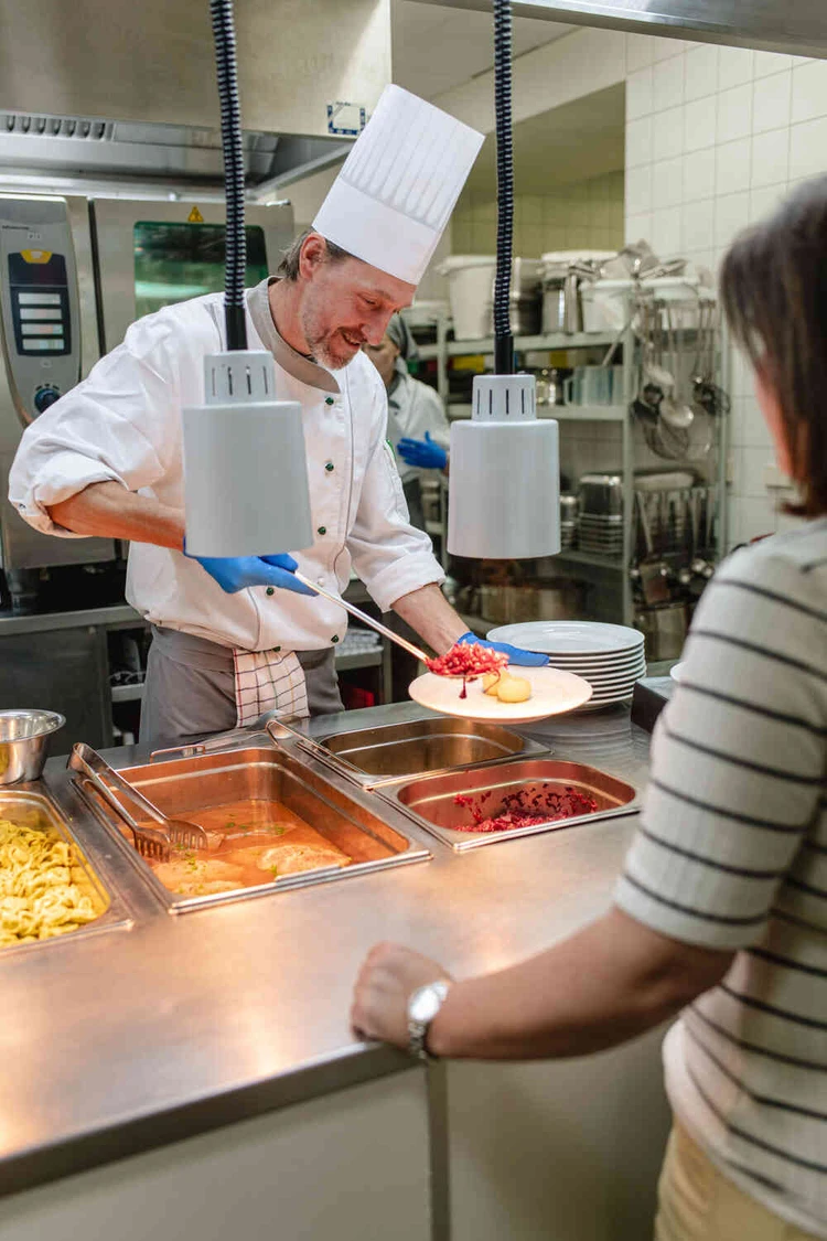 Bei uns kümmern sich Küchenchef Heinz Frommherz und sein Team um einen ausgewogenen und abwechslungsreichen Speiseplan. Zu den Hauptmahlzeiten können Sie zwischen verschiedenen Menüs, kalten und warmen Speisen wählen. Unsere Küche ist von regionalen und saisonalen Zutaten geprägt. Alle Mahlzeiten werden vom Küchenteam frisch zubereitet. Und auch auf spezielle Essenswünsche sind wir eingestellt – egal ob vegan, gluten- oder lactosefrei.